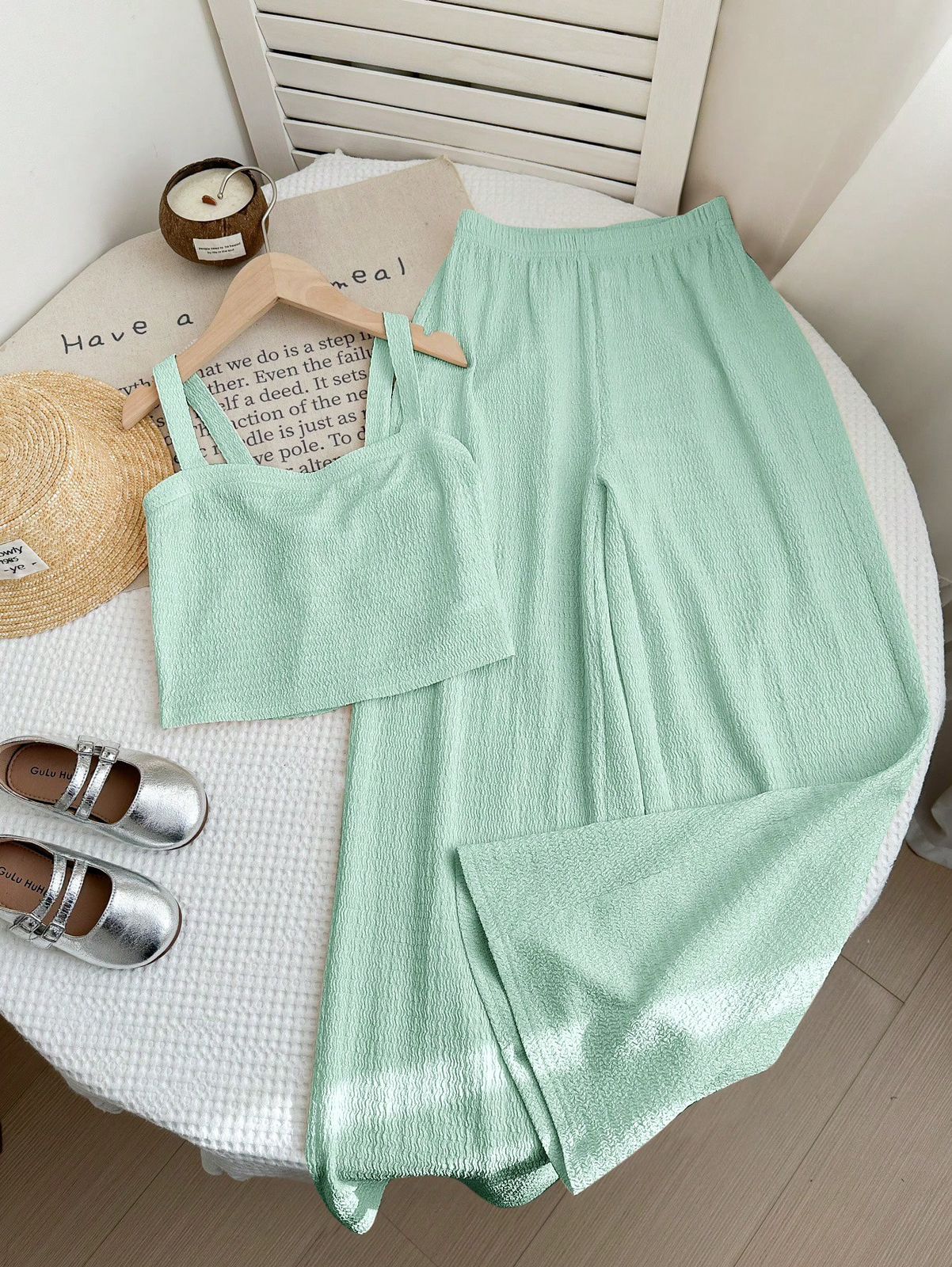 LMoss Kids Set de 2 piezas para niña preadolescente: Top de tirantes de unicolor tejido y pantalones de pierna ancha