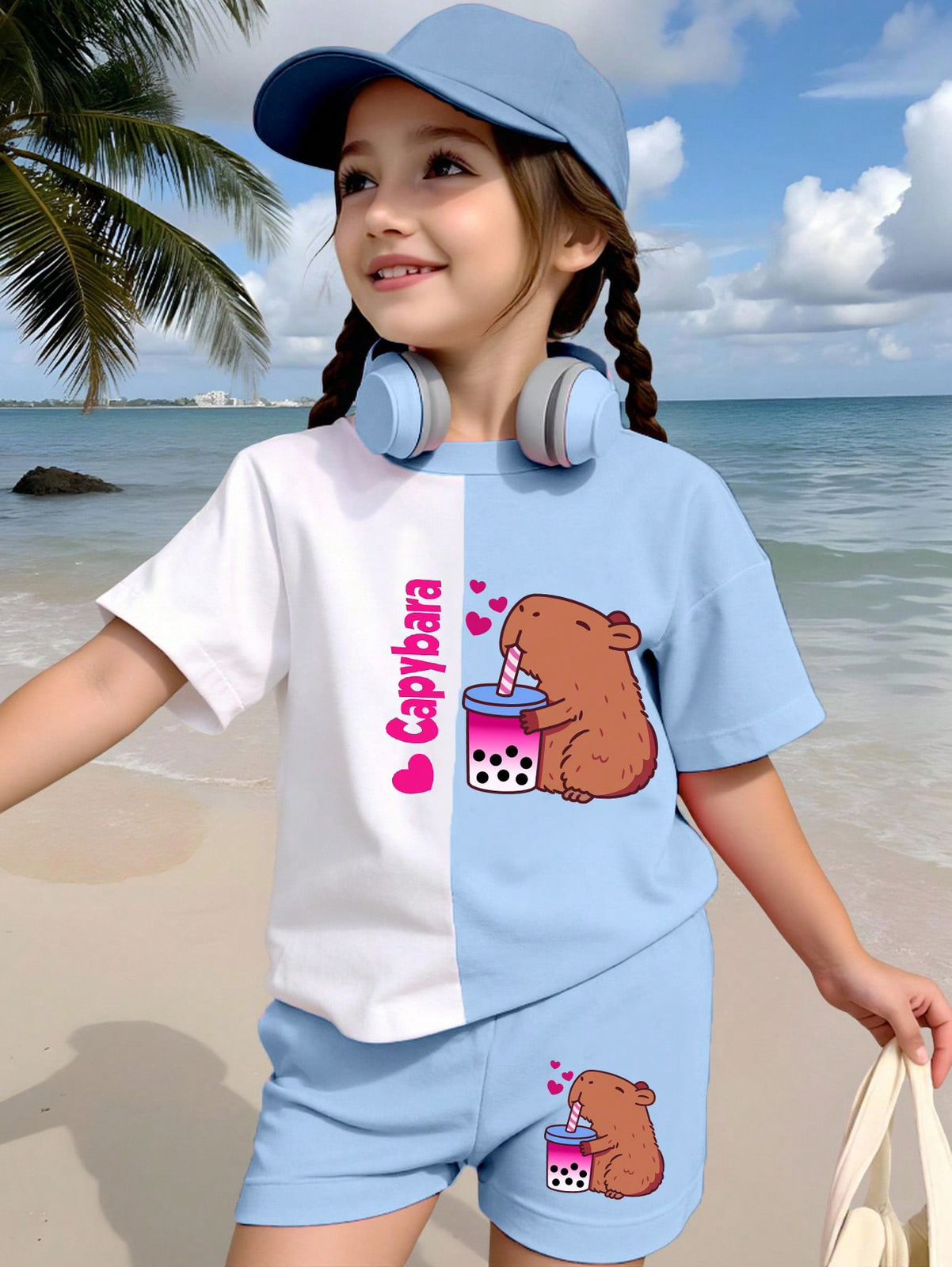Conjunto informal de 2 piezas para niña pequeña con camiseta con estampado de taza de té con leche y dibujos animados, y shorts de ciclista
