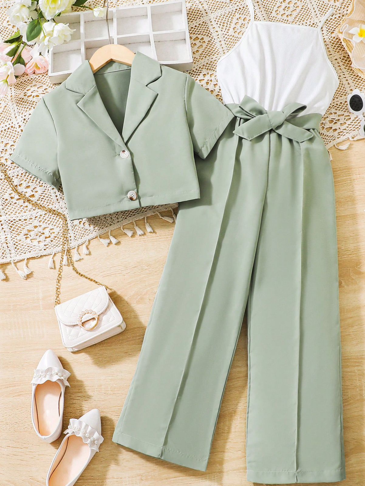 SHEIN Traje De Blazer De Cuello De Solapa Para Niña Adolescente Y Mono Cami Ajustado Con Cinturón